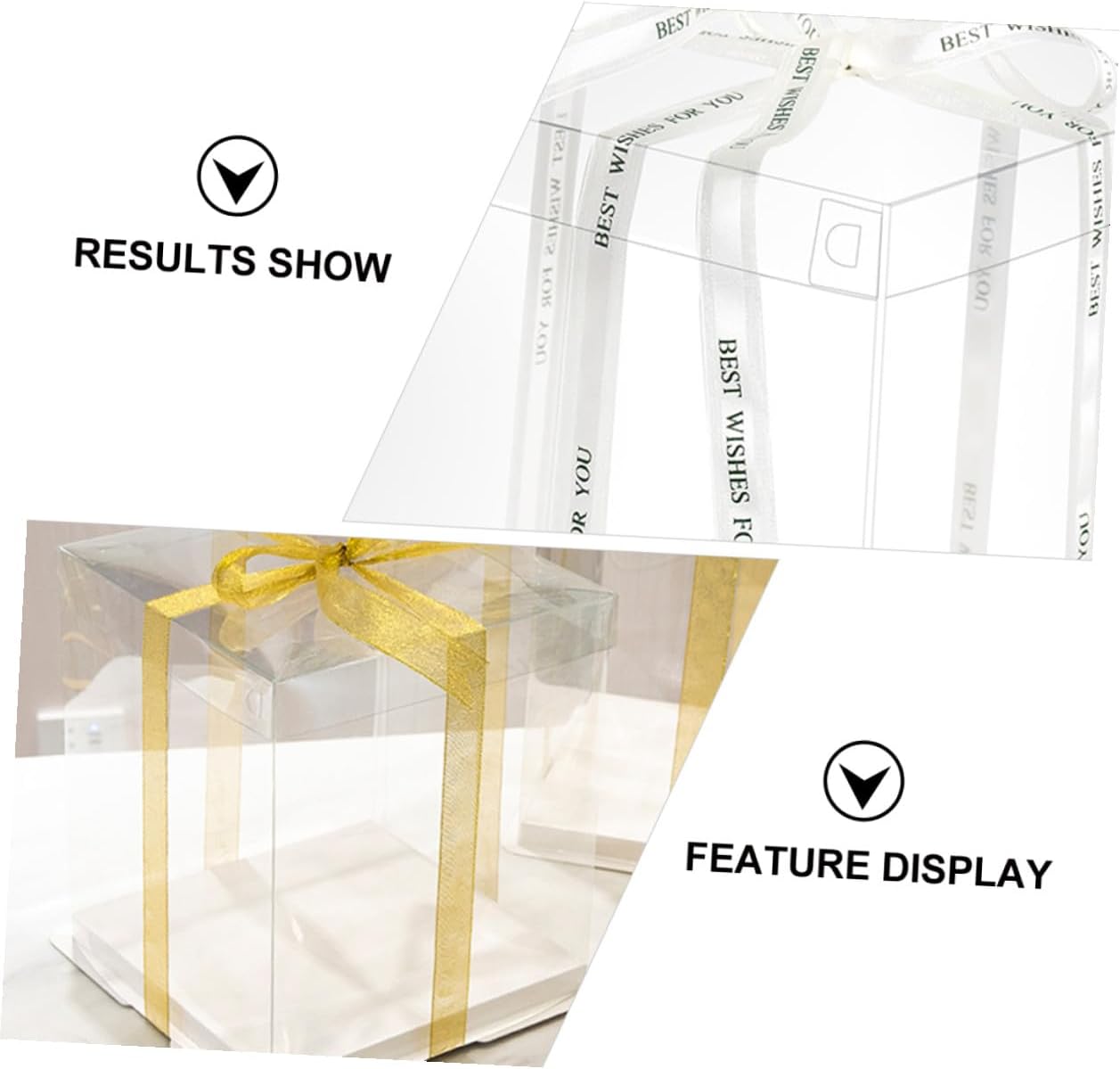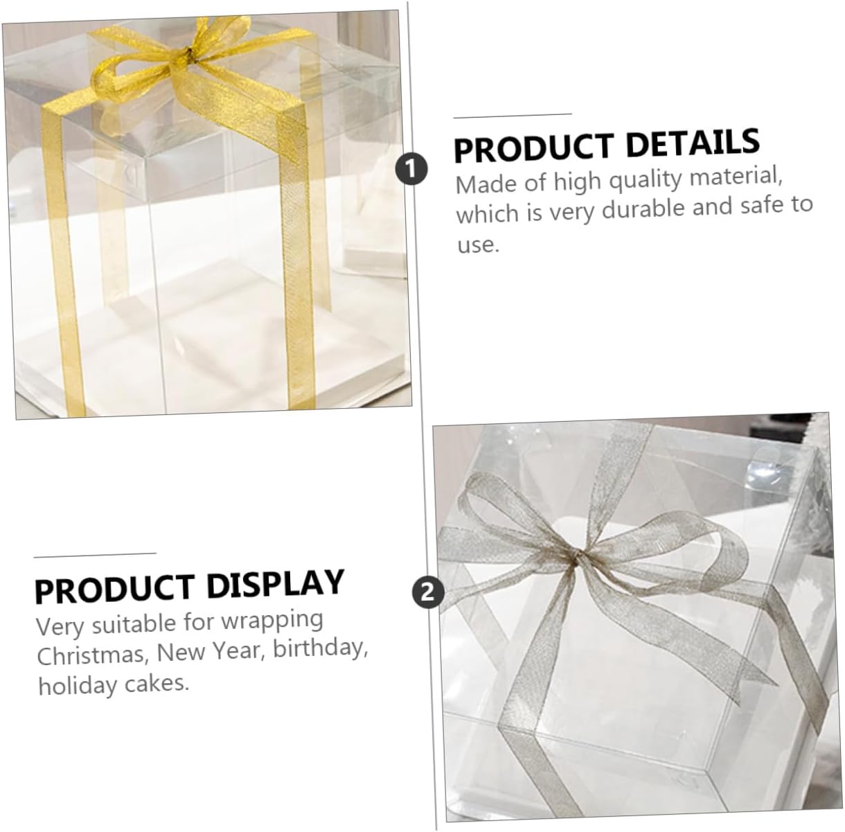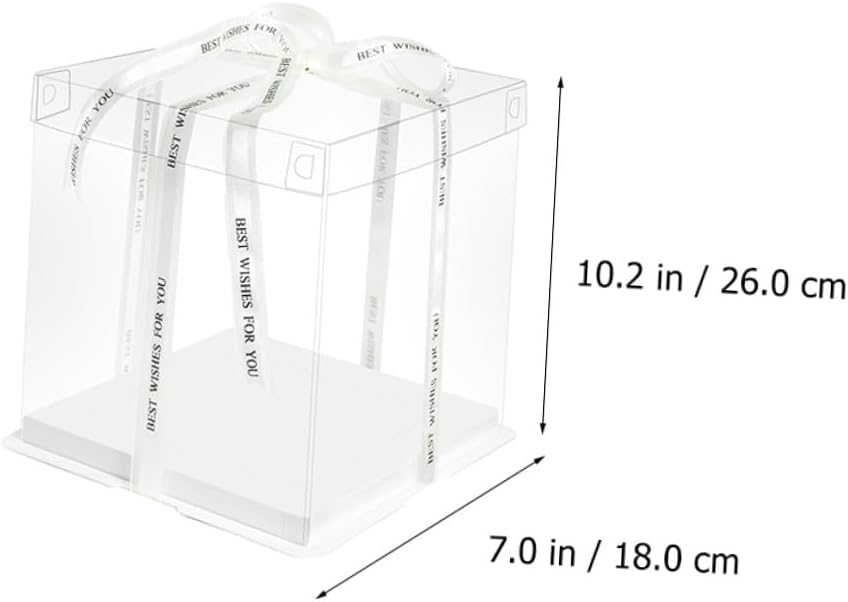 Package Include 5 x cake packaging boxes Features - Size: 26.00X26.00X18.00cm/10.22X10.22X7.07inch. -Product Info:Birthday Cake Box - Material: Food grade white card, PET. - Applicable: for 8 inch cake Square Storage Container. - Color: White (Random color for ribbon). - No bad odor, easy to clean, not easy to break, for car travel, outdoor picnics, etc Transparent Cake Boxes. - With ribbon for you to carry your cake or other food everywhere Cake Holder. - Ribbon design to keep the food sealed and prevent the cover coming off Food Packaging Boxes. - Very suitable for wrapping Christmas, New Year, birthday, holiday cakes Cake Container. - Made of material, which is very and safe to use.Goods DescriptionBaking Cake Container Transparent surface helps you see the inner clearly.Cake Holder It can be used for refrigerator or kitchen cupboard.Cake Container This item is a cake carrier, made of and sturdy food grade white card, PET material.Cake Carrier The ribbon design makes this storage organizer more portable and practical
